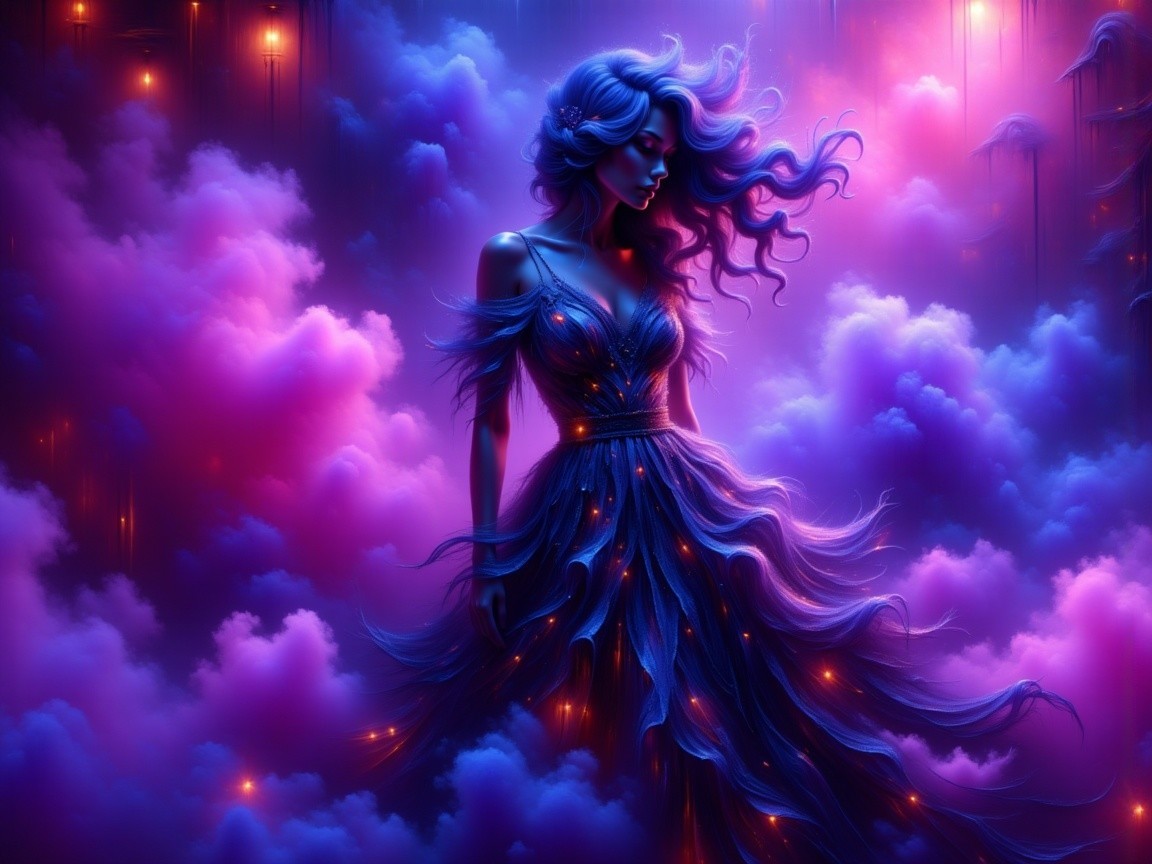 A futuristic woman stands in a vibrant, neon-lit cityscape. Her sleek, high-tech outfit shimmers with intricate patterns, reflecting the colorful lights, creating an ethereal and dynamic atmosphere.