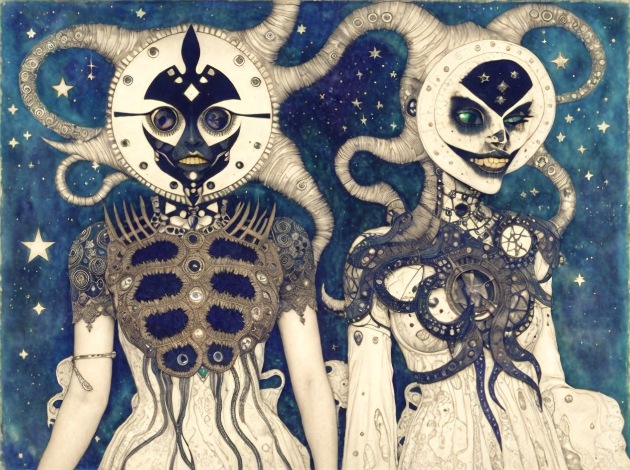 + Prompt:beautiful witches, eldritch landscape background, aurora borealis, eldritch details, cyberpunk, by Egon Schiele, Paul Klee mixed media, metallic inks by Gustav Klimt , "horror themed, ink details and realistic textures created by Dave McKean and Richard Corben