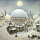 The image depicts a whimsical, surreal landscape featuring a large, round building with a snow-covered roof. Surrounded by stylized trees and a peaceful river, it evokes a dreamlike atmosphere.
