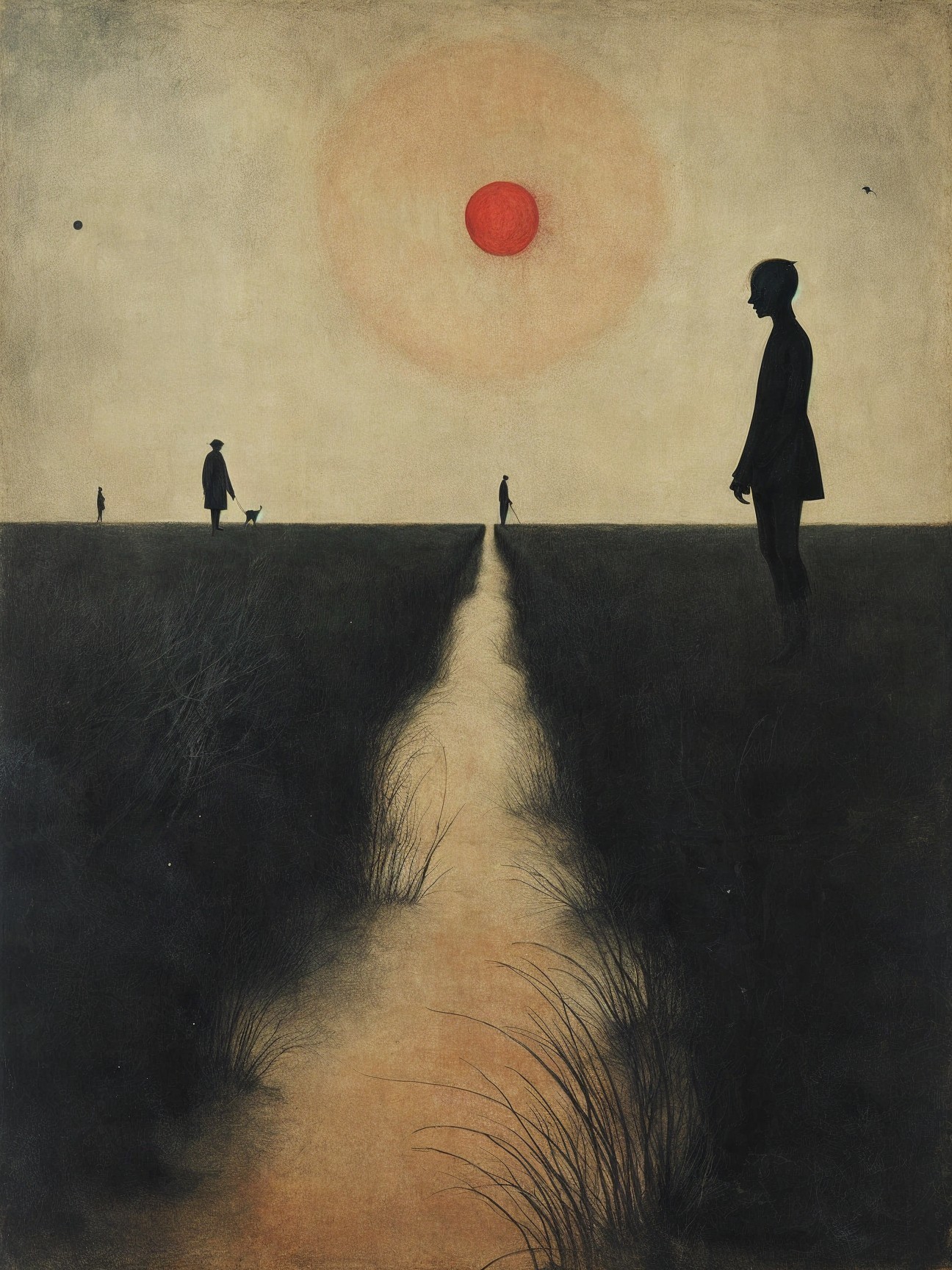 The artwork features a surreal landscape with a stark desert path leading toward a large red sun. Silhouetted figures—a person with a child and a lone figure—contrast against the dark foreground.