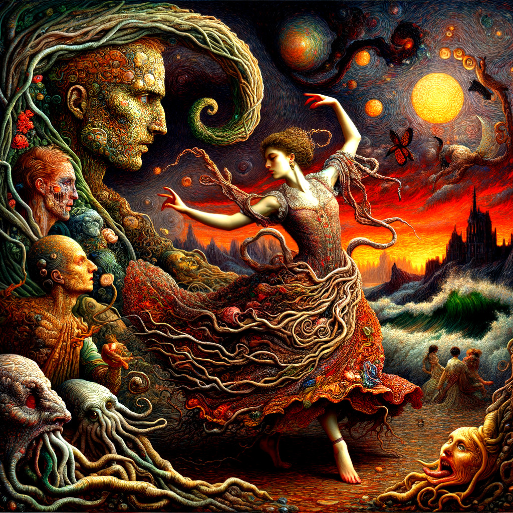 A stunning and intricate artwork inspired by various artists' styles like Klimt, van Gogh, and Bosch. It features a detailed woman in a short dress and bikini, with roots, scars, and a surreal setting of monsters in a school. The scene is set in a sunset and stormy day, with elements like red moon, flowers,