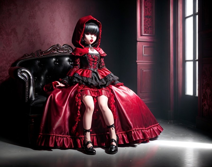 Prompt: "Mass realism, landscape mode, Red Hood girl that looks like a Pullip doll overdosed on ripe cherries, lies on the black leather couch in the dark Gothic style room, drooling red cherry juice out of her mouth, puddles of crimson squashed dark cherries on the floor, humpty dumpty is standing on the left by the couch, holds an intricate silver clock in his hand, humpty dumpty does a count down, background: black glowing tiles with an intricate floral golden design, floor: black and white tiles like a chess board, style by Nicoletta Ceccoli , by Thomas Eakins, by Bill Watterson, painstaking attention to detail, crisp quality, 8k, sharp, masterpiece, somber, uncomely, gross, gritty, ill-favored]"