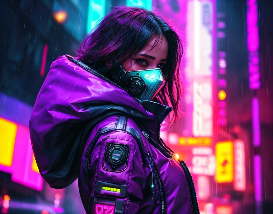 A cyberpunk woman exuding her action-hero status. In a futuristic mask and purple jacket, standing against a neon-lit, rainy futuristic city backdrop. Vibrantly colorful expressions of technology in the city.