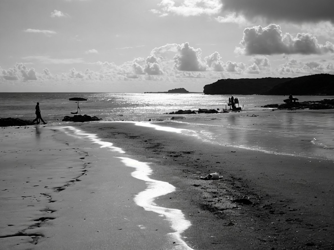 A serene black-and-white beach scene with gentle waves lapping at the shore. Sunlight glimmers on the water, casting shadows of clouds above and footprints leading into the distance.