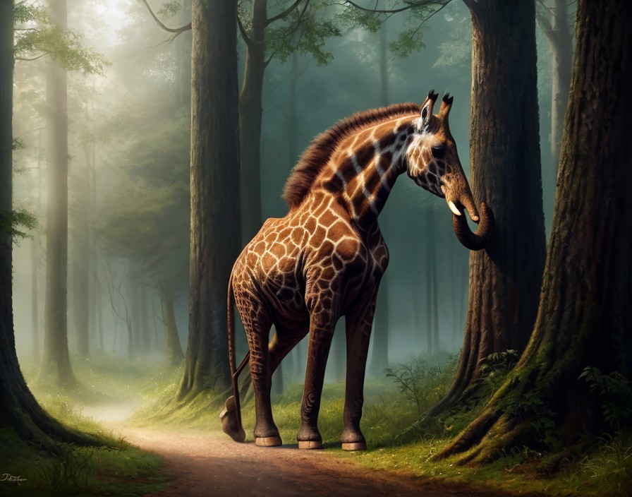 A surreal image of an elephant with horse features standing in a misty forest, merging two animals into one fantastical creature.