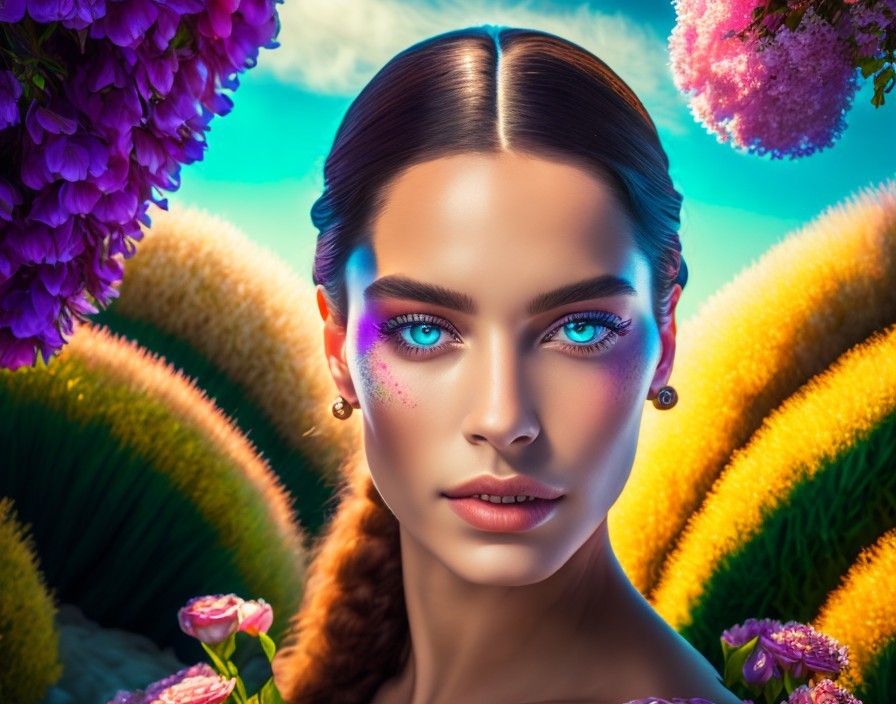Stunningly beautiful spring queen with beautiful eyes and beautiful mouth and multicoloured tresses; springtime Pacific landscape background; Dali, Burton, Nicolaes van Verendael, Patricia Coelho, Adolphe Millot, Barker; cel-shaded; Nikon 15mm f/1.8G; volumetric lighting; high contrast; vibrant colors; high-chroma; HD; dark shadows; 8k resolution; creeping darkness; pencil sketch; wide-angle lens