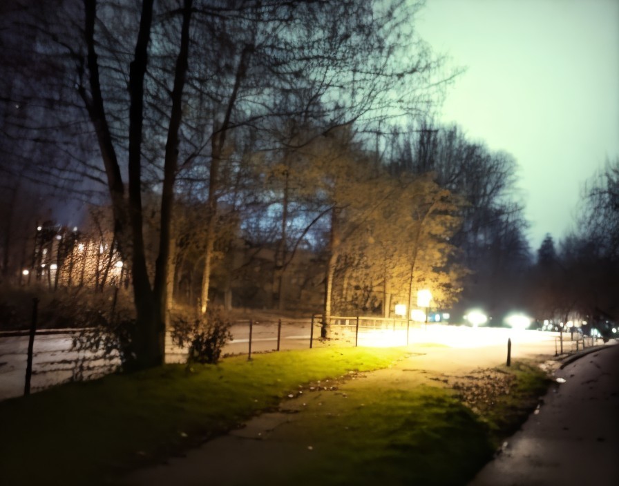 A tranquil night scene featuring a tree-lined pathway illuminated by street lamps. Shadows stretch across the road, and green grass contrasts with the darkened surroundings.