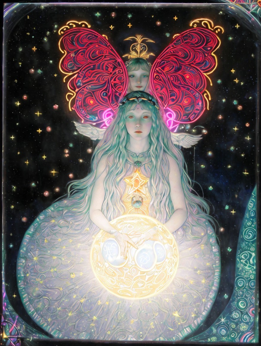 A mystical figure with intricate butterfly wings and flowing hair holds a glowing orb, surrounded by a starry night. The artwork blends ethereal beauty with enchanting light.