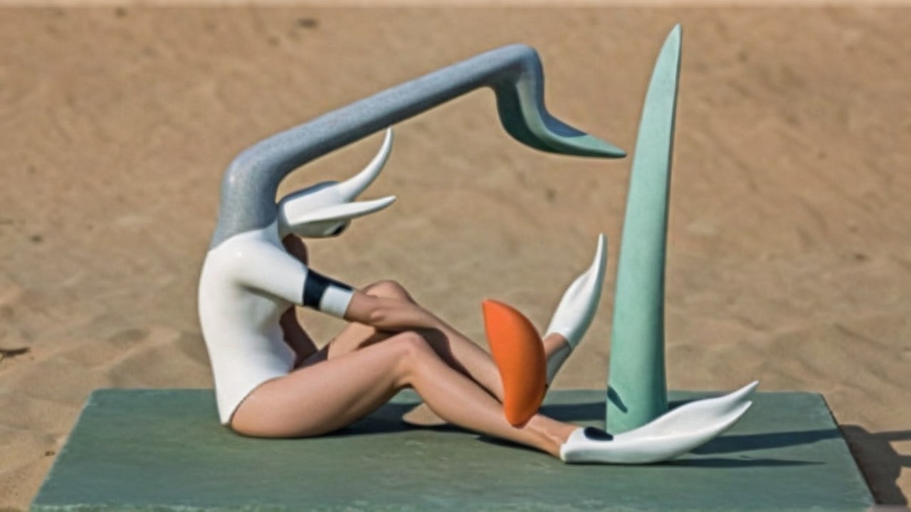 A minimalist sculpture of a seated figure amidst abstract geometric forms in a sandy landscape, combining smooth curves with sharp lines, evoking a sense of tranquility and contemplation.