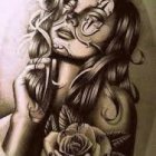A woman with intricate face makeup inspired by traditional motifs holds a makeup brush. Her vibrant tattoos and decorative earrings complement her striking look against a sunset backdrop.