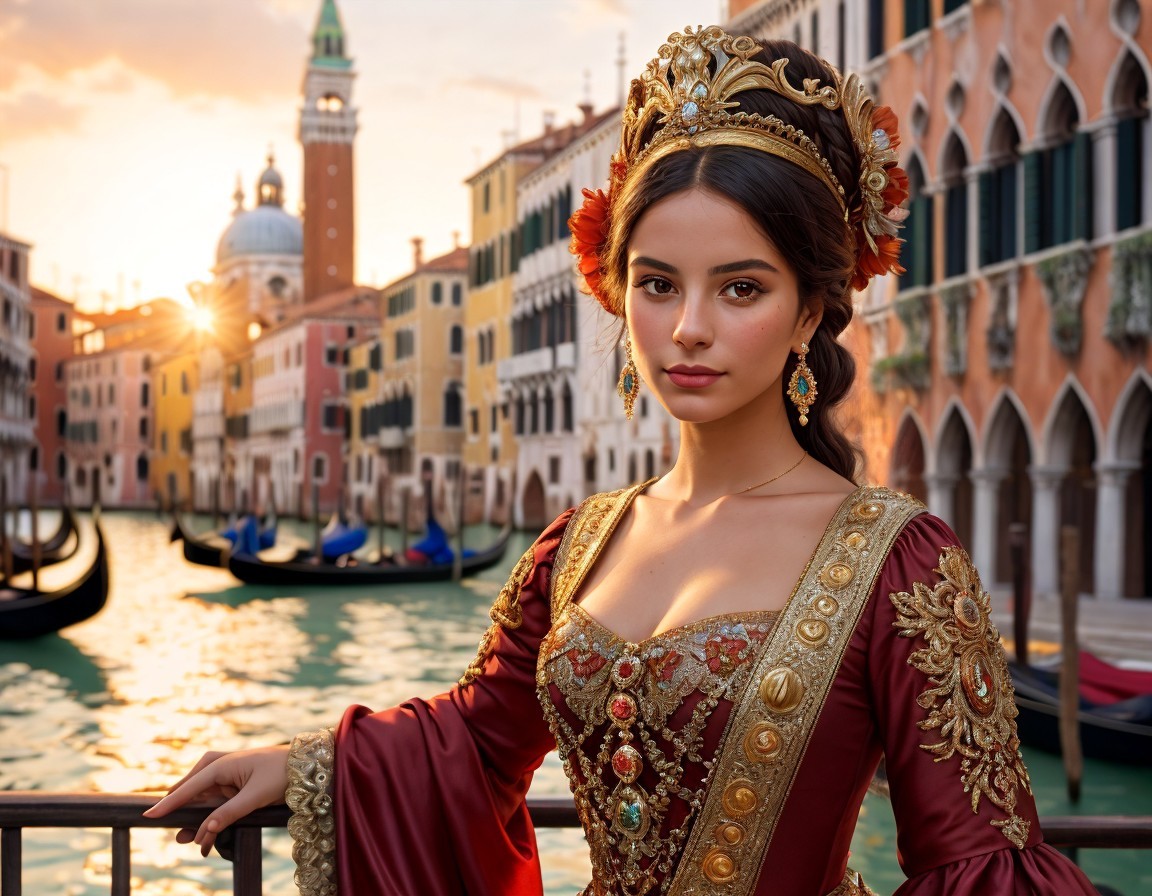 Prompt: "a young beautiful Venetian woman from 17th century, 30 years old, stand posing in Venice, intricate, hyper-detailed, magic atmosphere, sunset, in the style of andreas franke, focus on red and gold, hyper-realistic, carnivalcore, cinestill 50d, detailed facial features, glowing colors, 32K,"