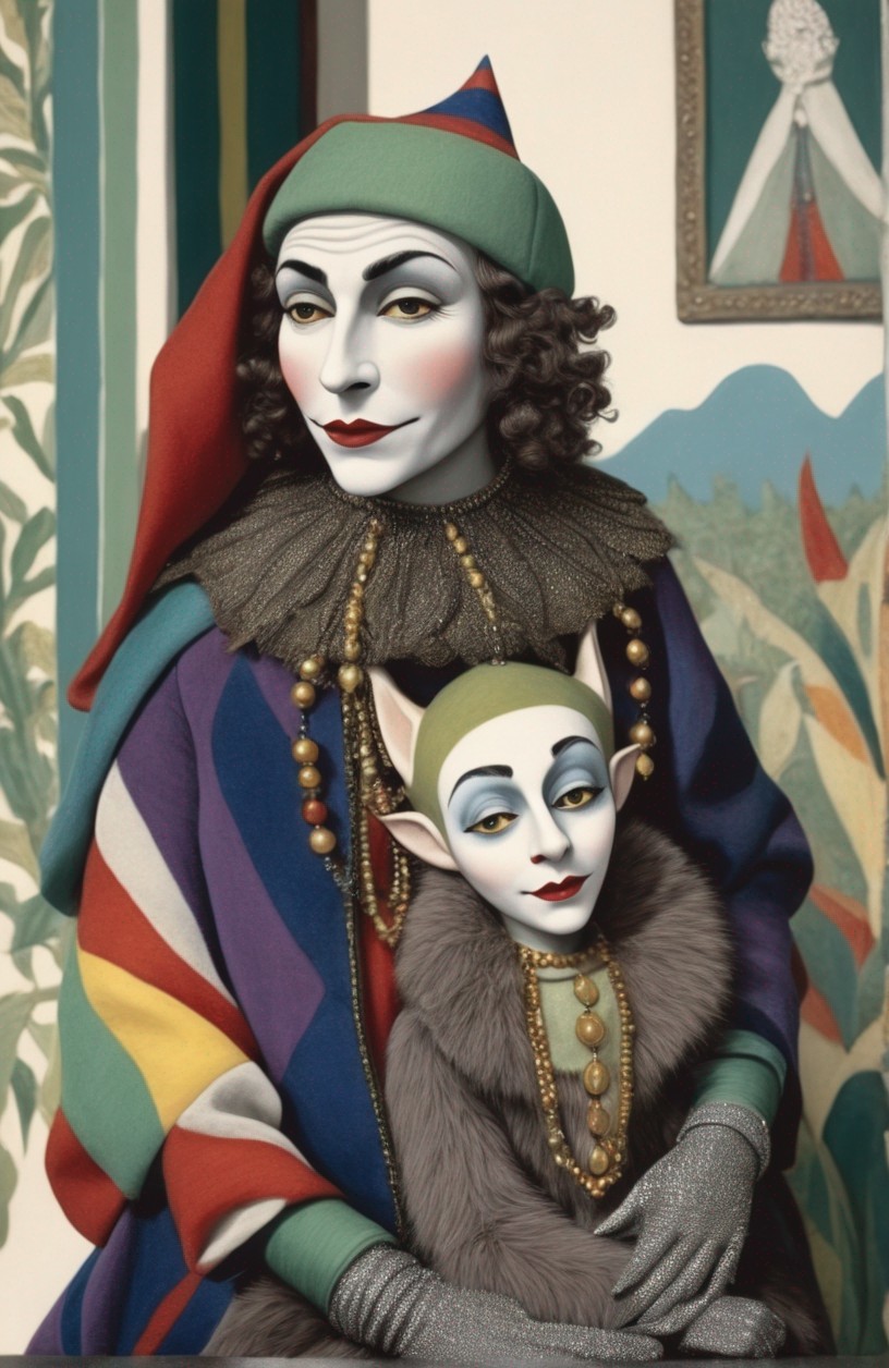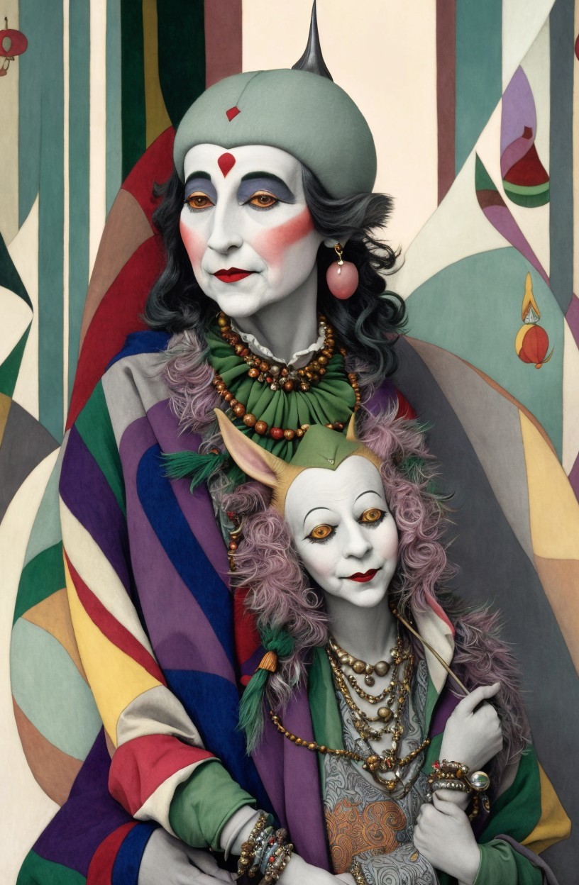 A stylized painting of two characters with elfin features in regal attire, one behind the other, with a castle in the background.