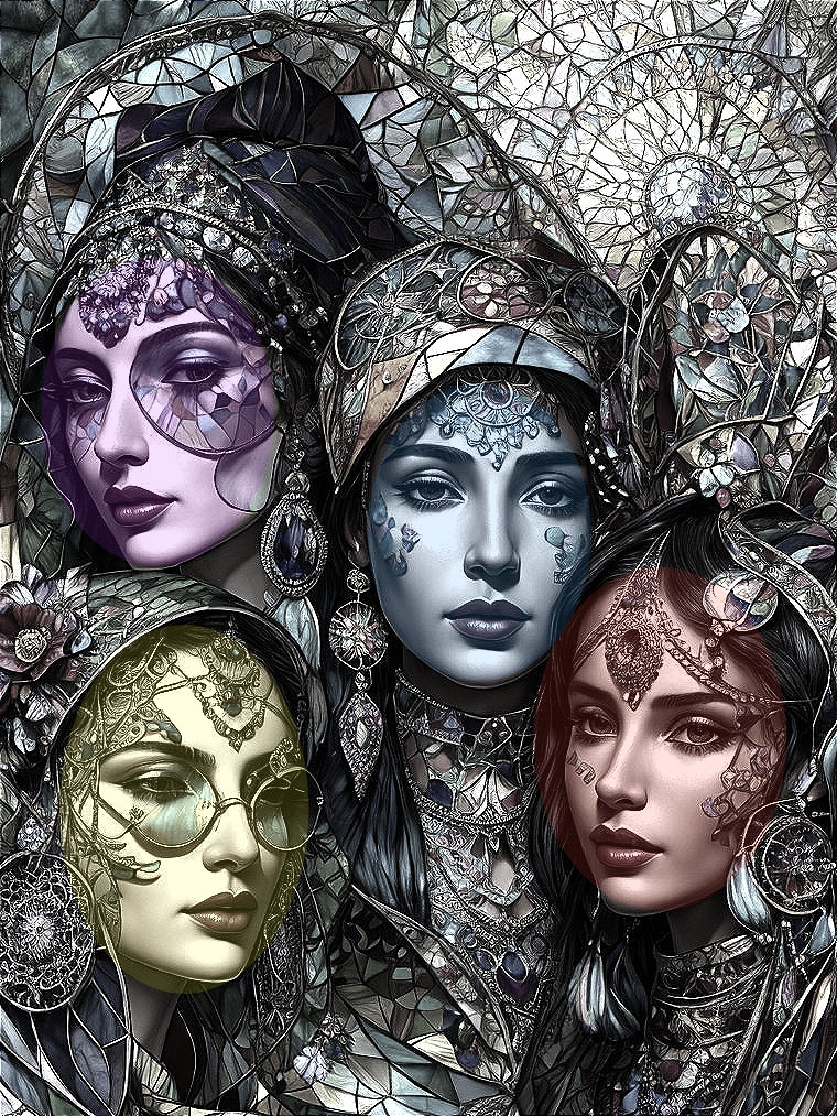 Four diverse women adorned in intricate, colorful patterns resembling stained glass. Their vibrant makeup and elaborate accessories create a stunning visual harmony, blending tradition with modernity.