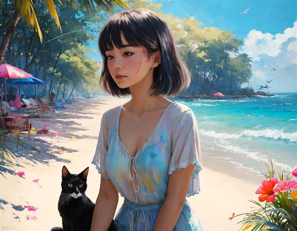 A serene beach scene features a young woman in a light dress, standing beside a black cat. Lush greenery and colorful flowers frame the tranquil ocean background, evoking a peaceful summer day.