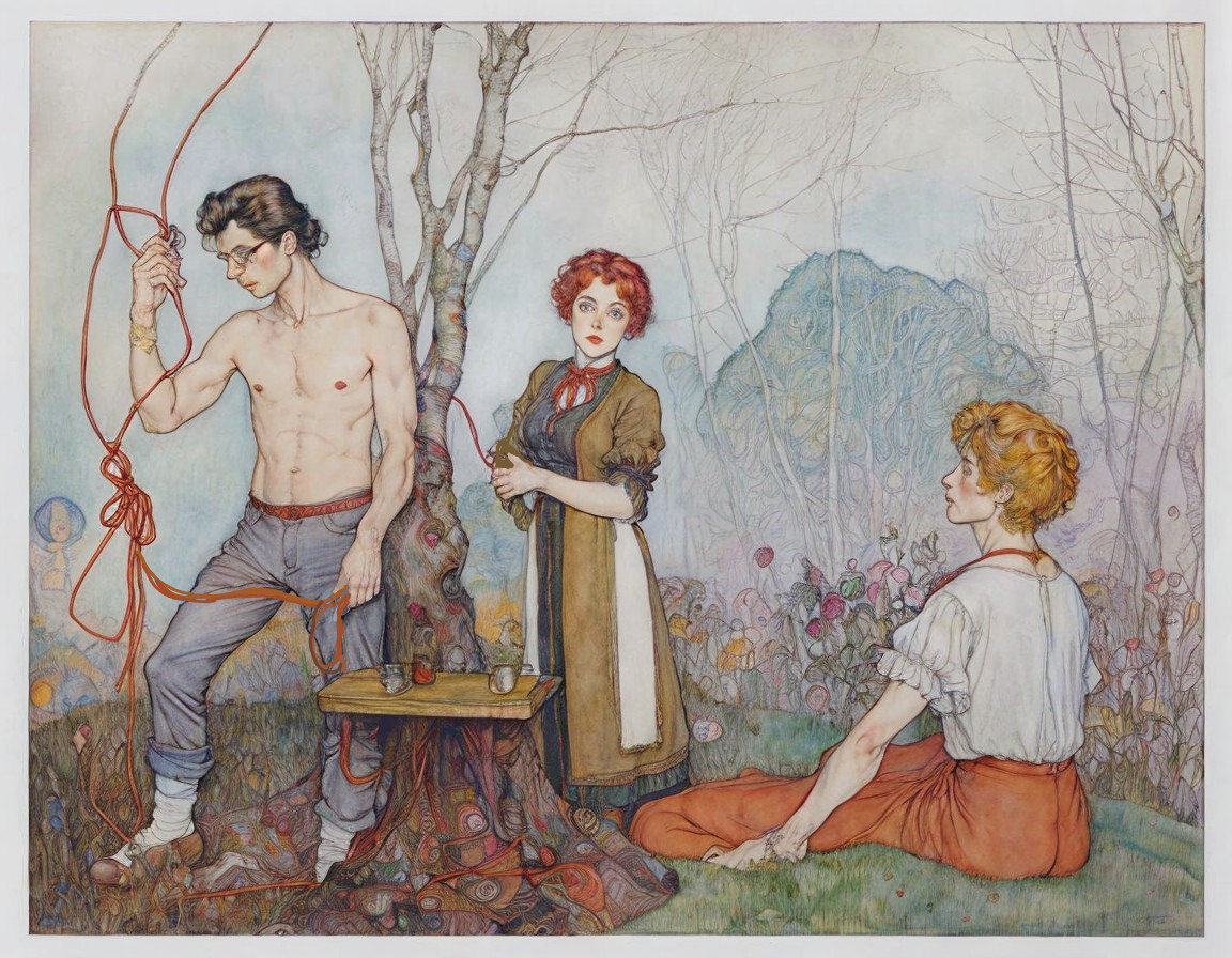 + Prompt:Egon Schiele style. A man is holding a long red string, a woman is sitting there giving instructions, cat, a man is standing in the background and watching this scene.