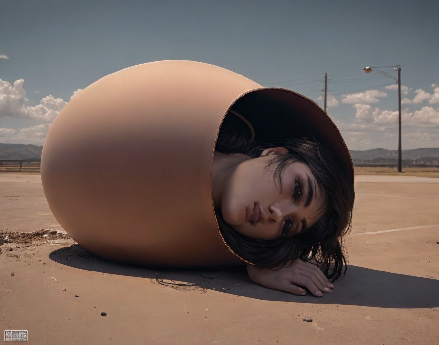 Astronaut Inside Cracked Boulder in Desert Landscape