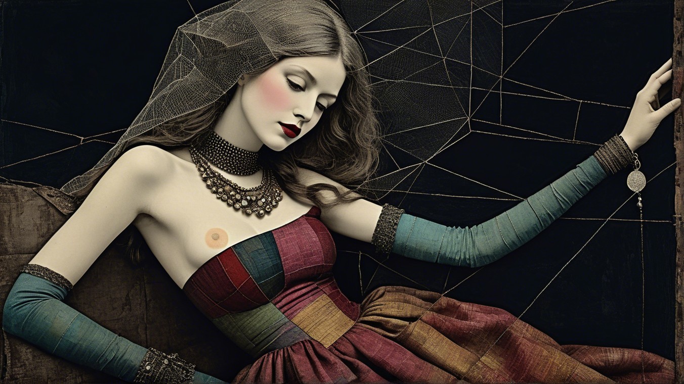 A striking figure lounges elegantly, adorned in a vibrant, vintage-style dress. Her blue hair and rose accessories contrast against a dark, textured background, evoking a sense of timeless beauty.