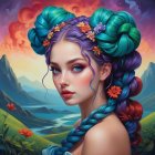 A vibrant portrait of a woman with intricate, colorful hair styled in bold buns. She has striking red makeup, set against a vivid landscape of swirling colors and lush mountains.