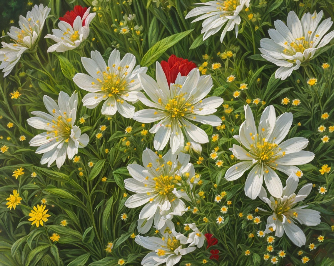 Prompt: Intricate 3D oil painting, delicate filigree details, fine lines showcasing white onion blossoms, tiny dwarf, lush and dense vegetation, bees, vibrant red buds contrasting with small yellow daisies, meticulous attention to detail, inspired by the style of Trisha Hardwick and Yana Movchan, high-resolution, rich color palette with emphasis on whites, greens, reds, and yellows, sunny lighting and shadows to accentuate the intricate details.