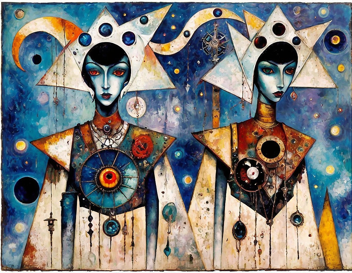 Abstract art of two figures with blue faces, ornate crowns, and celestial motifs, set against a starry background.