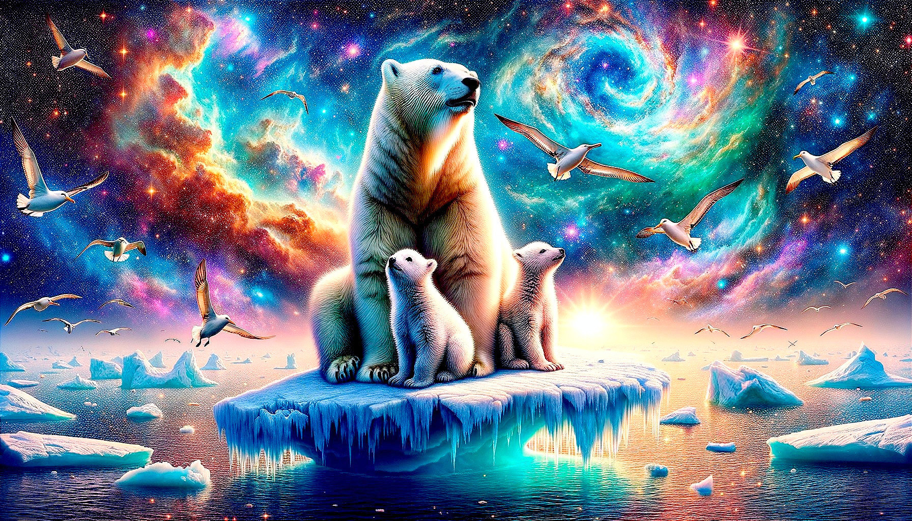 A stunning hyperrealistic painting captures a majestic polar bear with her cubs on an ice floe, set in a celestial realm with a swirling nebula, albatross, and a psychedelic sunset backdrop. The intricate details and vivid colors make it a mesmerizing masterpiece.