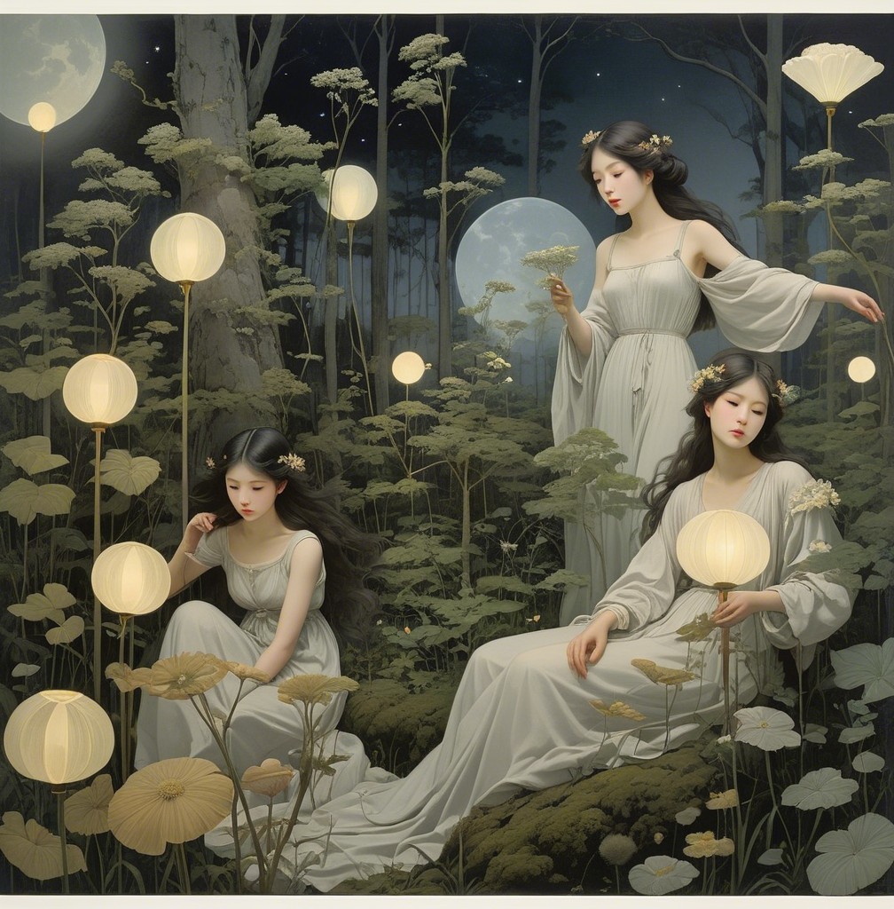 In a serene forest at night, a young woman in a flowing white gown sits peacefully among softly glowing orbs. The moonlight bathes the scene, creating an enchanting, dreamlike atmosphere.