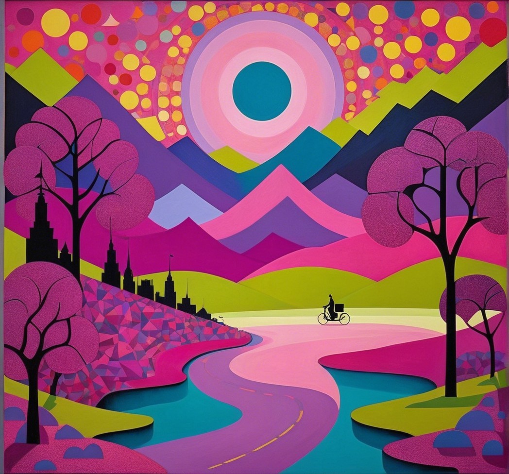 A vibrant, abstract landscape featuring bold pinks, purples, and greens. Silhouetted figures stroll by a river, with stylized mountains and a circular sun enhancing the colorful scene.