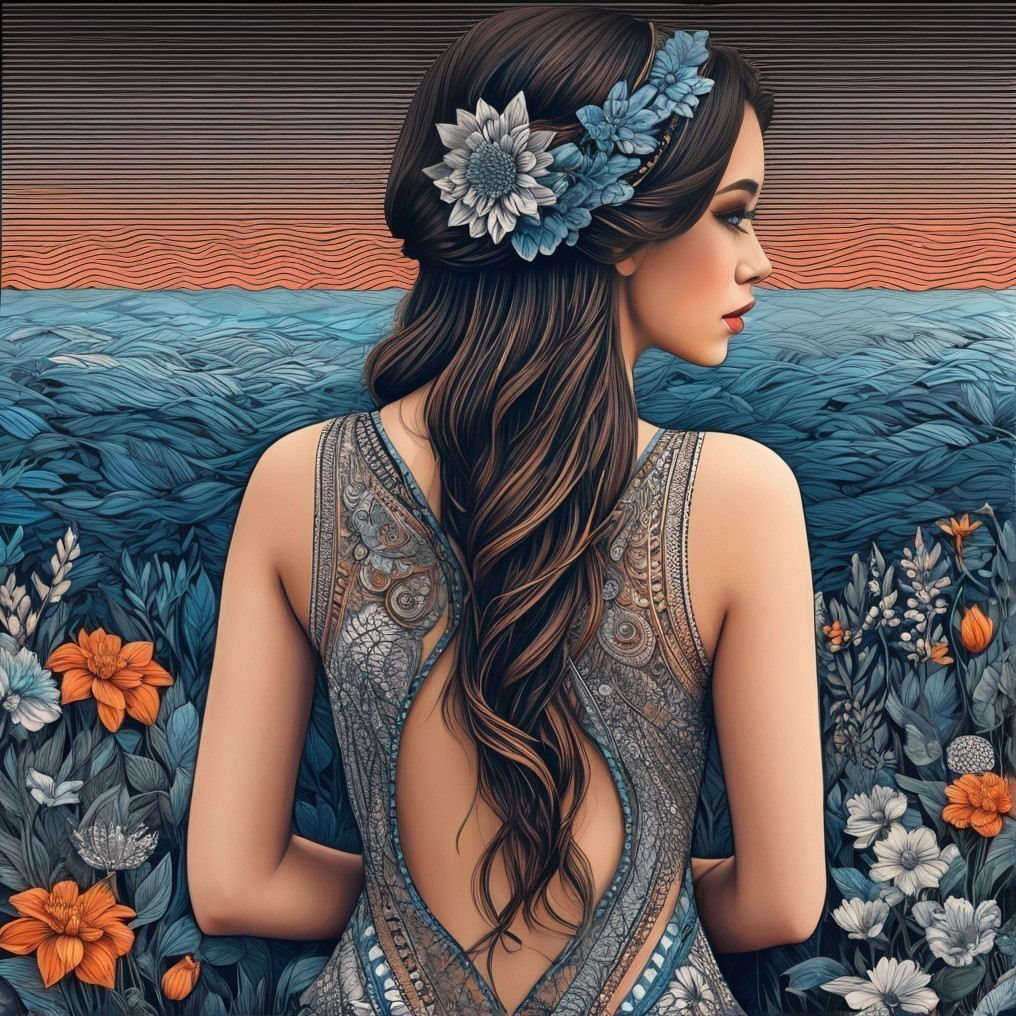 A woman in a patterned dress sits by the water, her long hair draped down her back, with fruits nearby, conveying a serene and contemplative mood.
