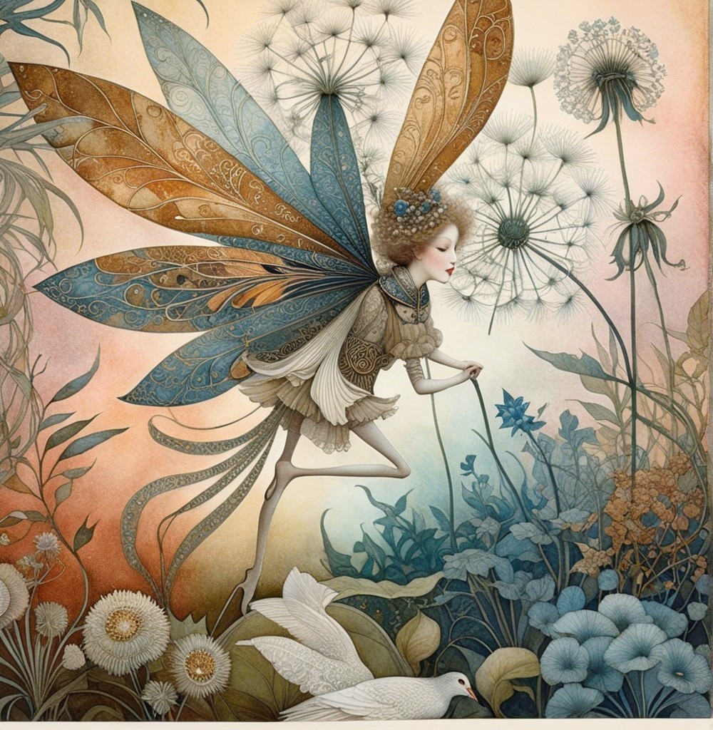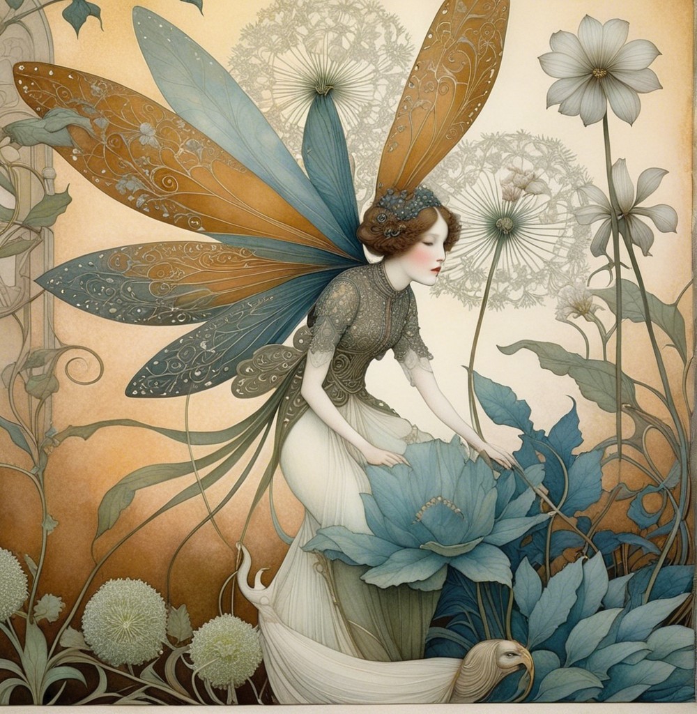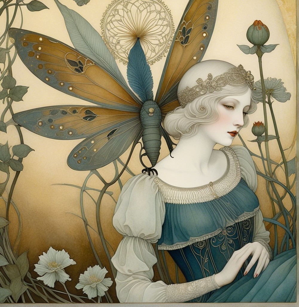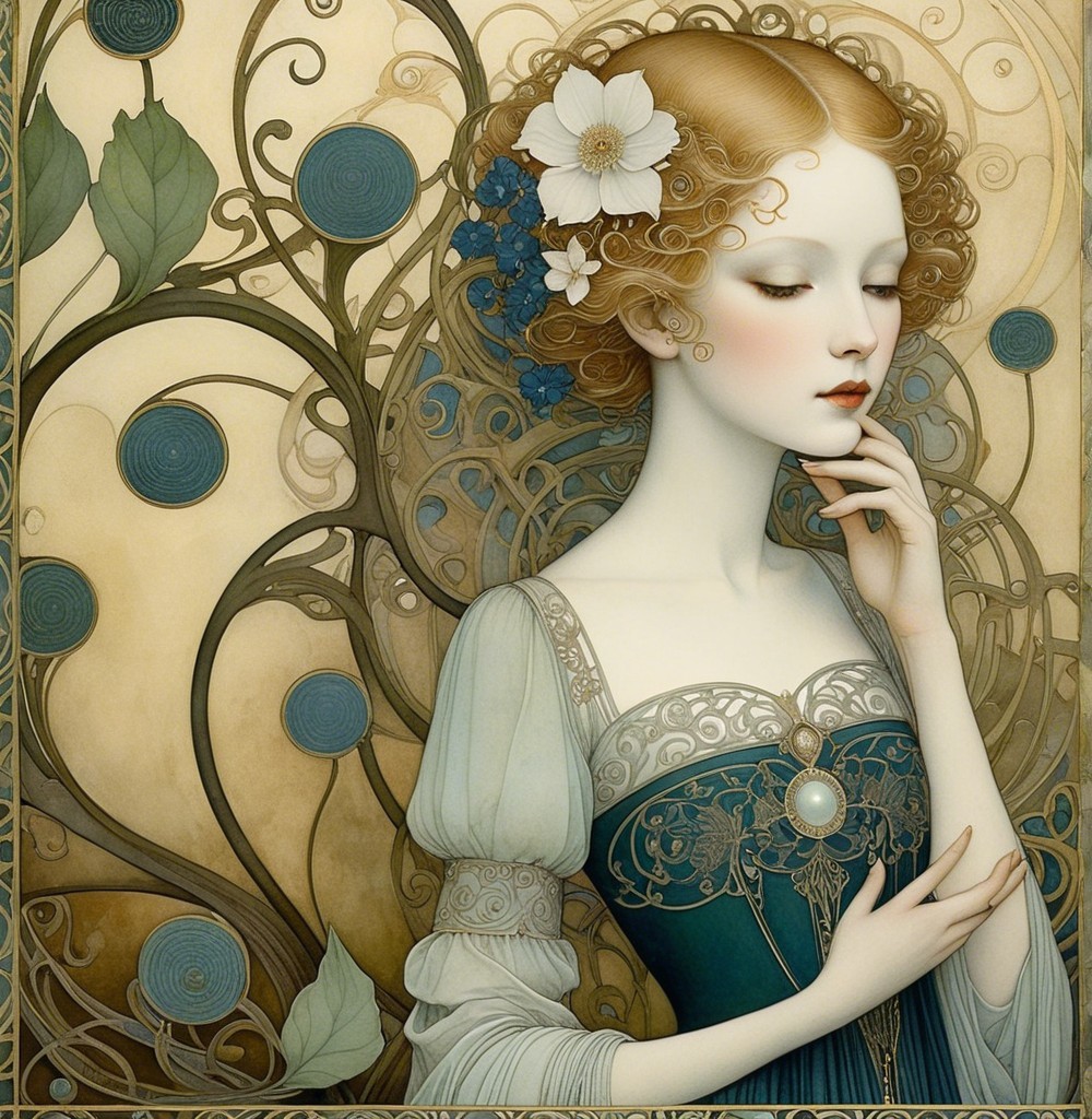 A serene woman with elaborate, curly hair adorned with flowers and intricate jewelry. She wears a blue garment, surrounded by delicate leaves and floral motifs, evoking a sense of elegance and grace.