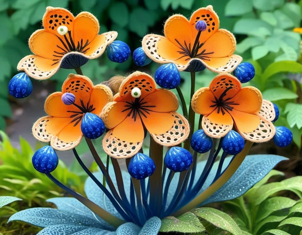 turn the prompt into a 3d, 4k resolution, rendering of the flowers as if made out of delicate and outstanding crochet. as if by the fairy godmother of crochet. maintain the rich colors of the flowers but fade out the background foliage by 30%.