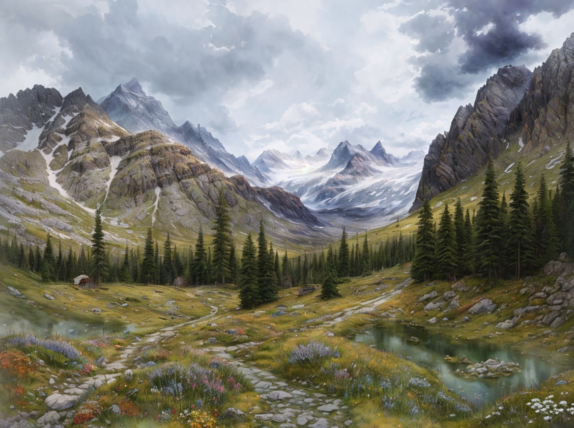 + Prompt:A mountain pass with breathtaking views Muted coloured art in the style of by Alexander Jansson,,mind blowing landscape ,dramatic fantastical, surrealistic, elegant, beautiful, high definition, striking drawing, artstation, intricate, award winning, fantastic view, fantasy, elaborate, HDR, crisp quality,, heavenly