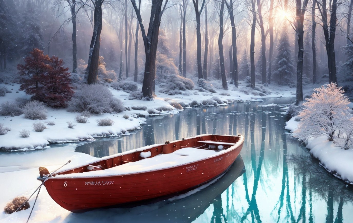 Fantasy winter wonderland landscape by Thomas Wells Schaller, boat in the the middle of a shimmering pond, ice covered trees, sunrise, light reflections, bokeh, Greg Rutkowski; digital artwork, a masterpiece, photographic realism, complementary colors, 8k resolution, hyperdetailed, volumetric lighting, sharp focus