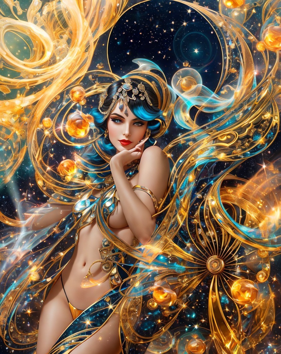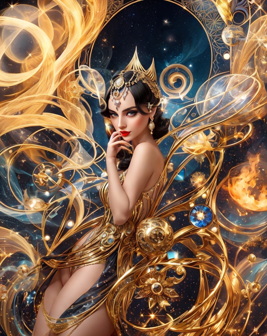 A mystical woman adorned with cosmic and golden elements, surrounded by stars and celestial symbols, radiates an aura of enigmatic beauty.