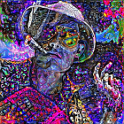 The image features a striking figure wearing vibrant, patterned clothing and oversized glasses, exuding a retro, playful vibe, with an artistic, psychedelic background enhancing the bold look.