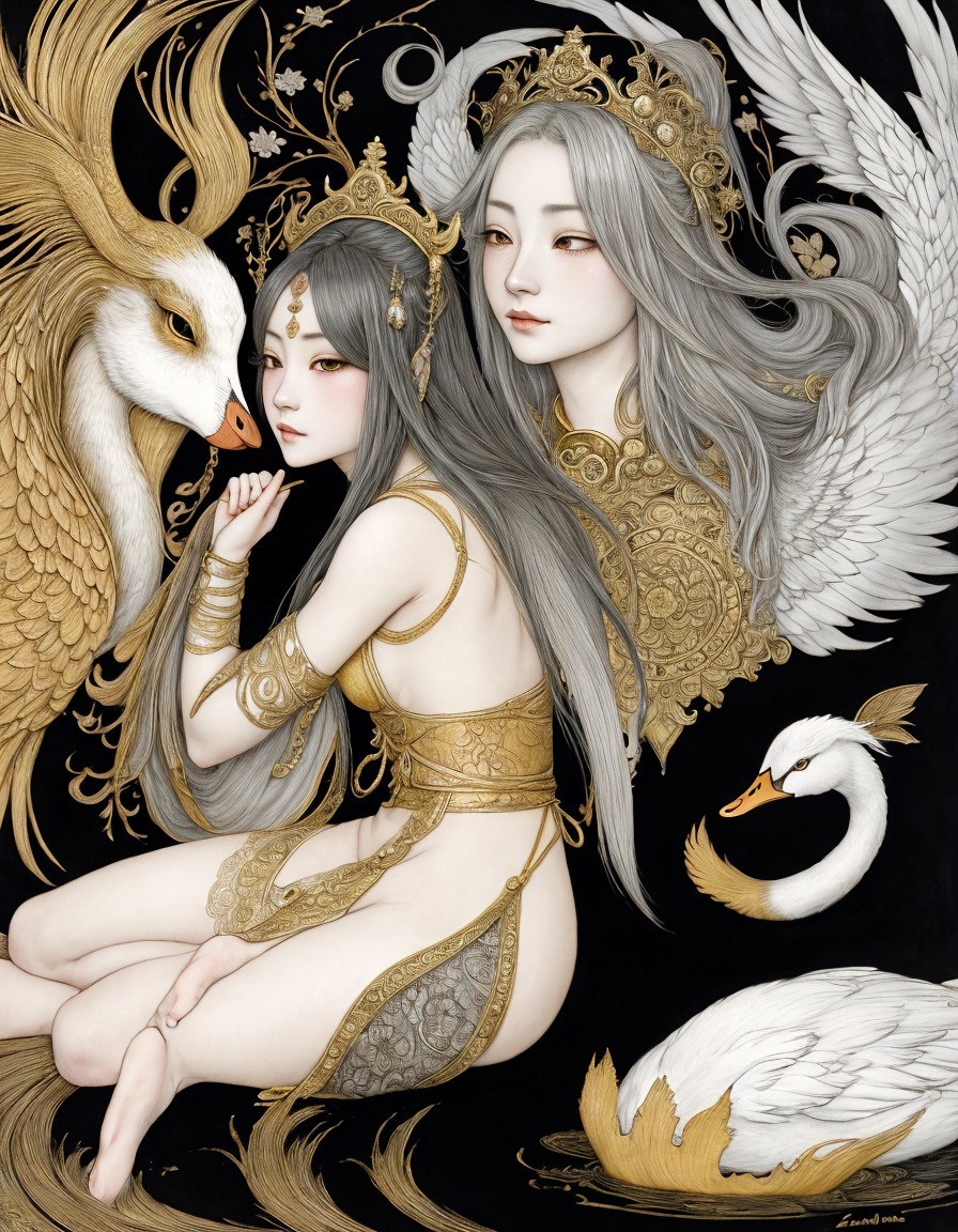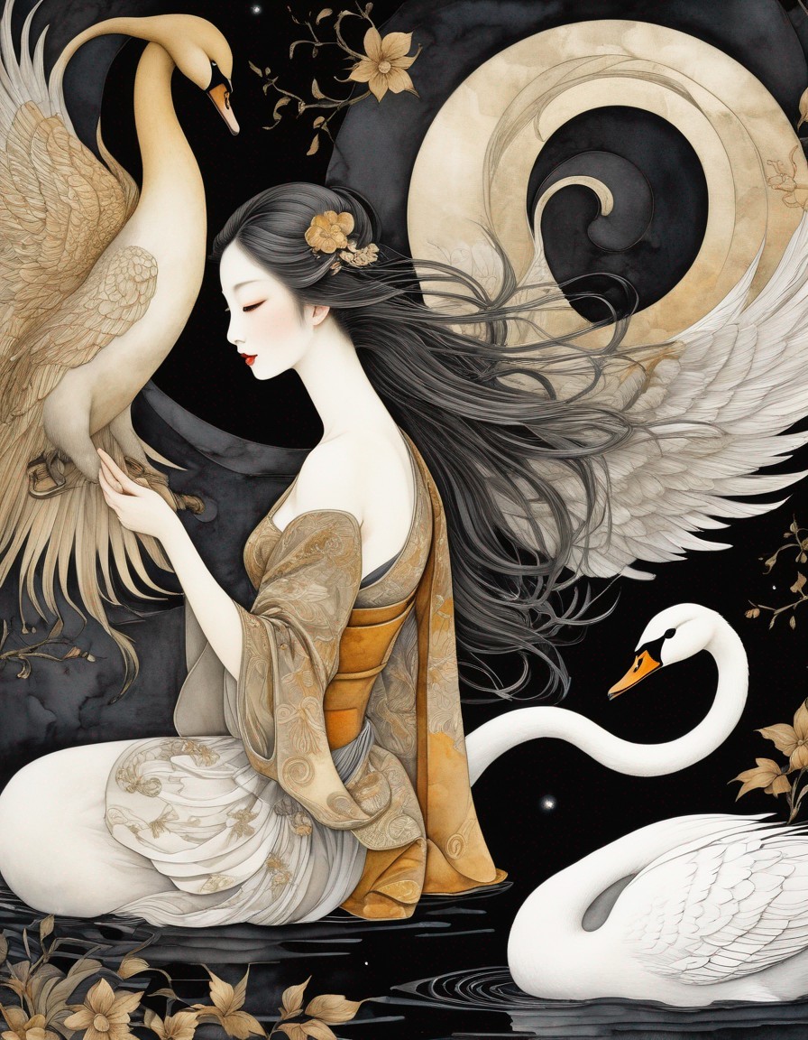Legend of the Girl and the swan, Medieval Japanese Artists Sumi-e Style, Velvet Black, Shabby, Dull Gold, Amber Gray, Golden Ratio, Surreal Fantasy, Elegant, High Definition Ultra Fine 3D Line, Zenangle Style, Watercolor Patchwork , Arthur Rackham Style, Paul Kidby, Gediminas Prankevicius, Jacek Jerka, Extremely Detailed, Intricate, Thoughtful, HDR, Fractal, Beautiful, Award Winning, Fantasy Look, Fantasy, Crisp Quality