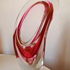 A surreal scene featuring two black cats perched inside an abstract, red structure, while an orange cat sits outside. The background is soft with muted colors and a small sun in the sky.