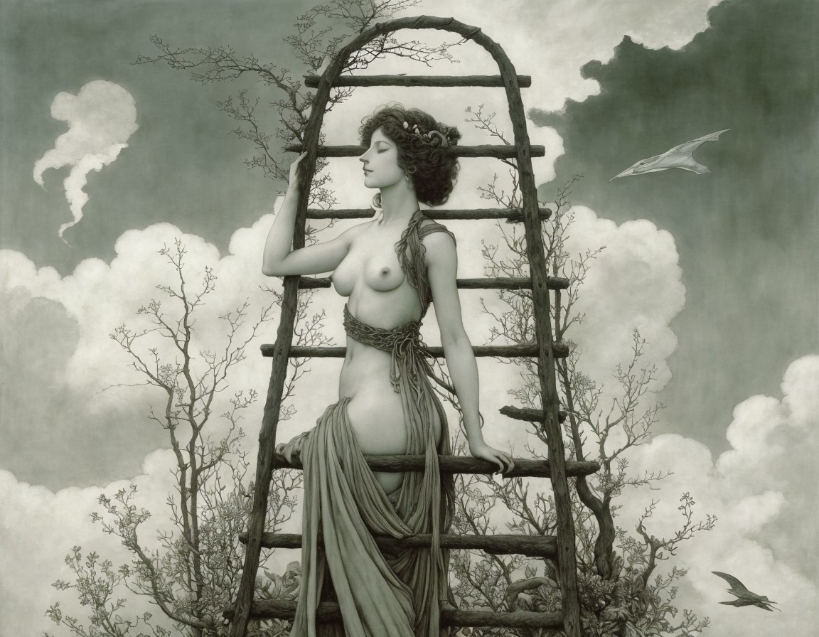 The image features a woman in a flowing dress, standing against a grand, multi-tiered structure under a cloudy sky. She gazes thoughtfully, with intricate details in the architecture and figures.