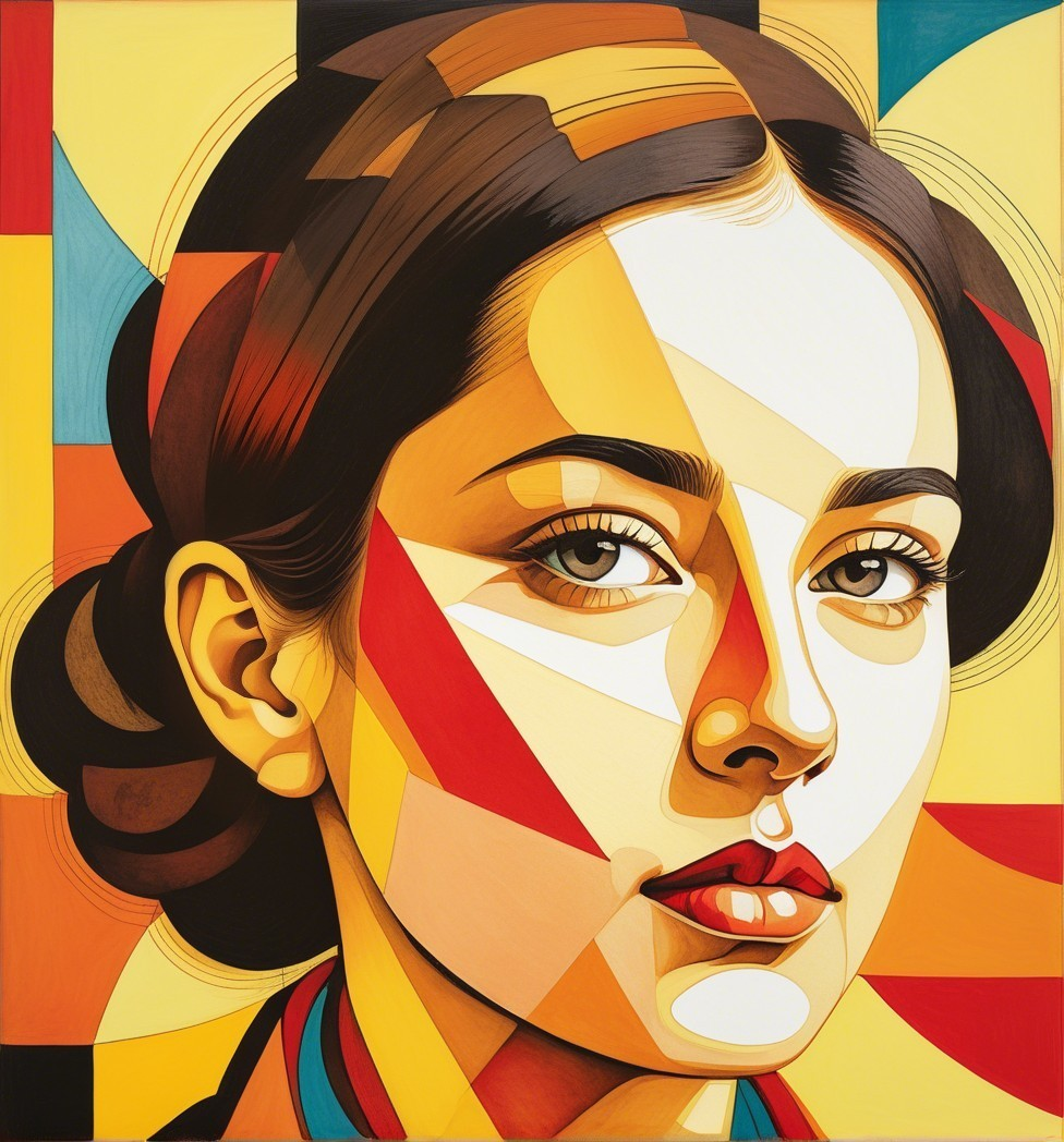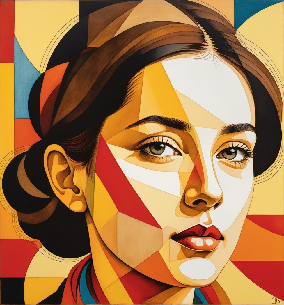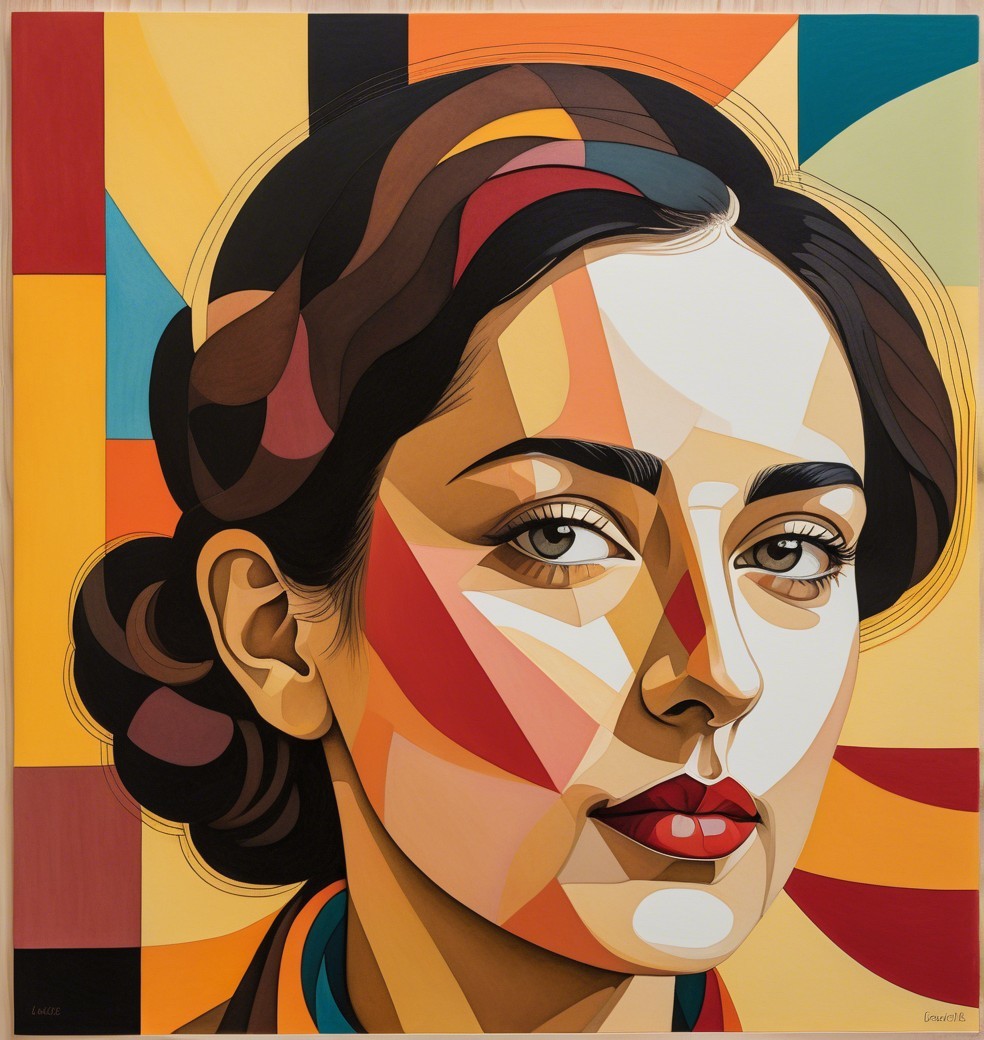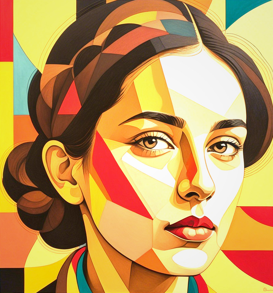 The image features an abstract portrait of a woman, characterized by geometric shapes in vibrant reds, yellows, and browns. Her expressive eyes and smooth lips add depth to the colorful composition.