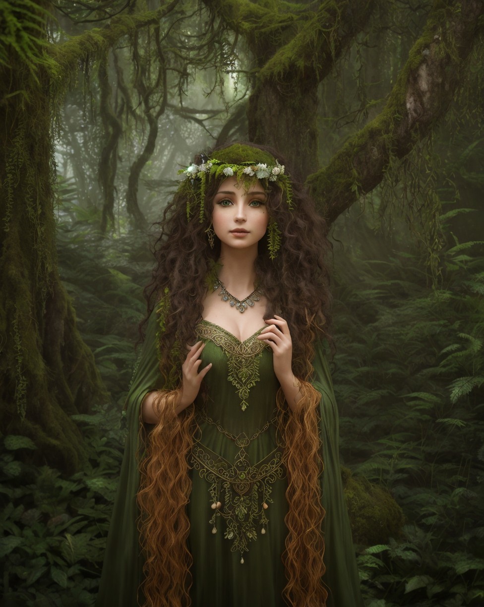 + Prompt:a place where moss and ferns cover the forest floor and mischievous nymphs play amongst the shadows.