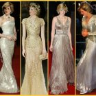 The image features four elegant evening gowns worn by a woman, showcasing varied styles and colors, including silver, gold, and embellished designs, highlighting sophistication and glamour. Princess Diana of wales