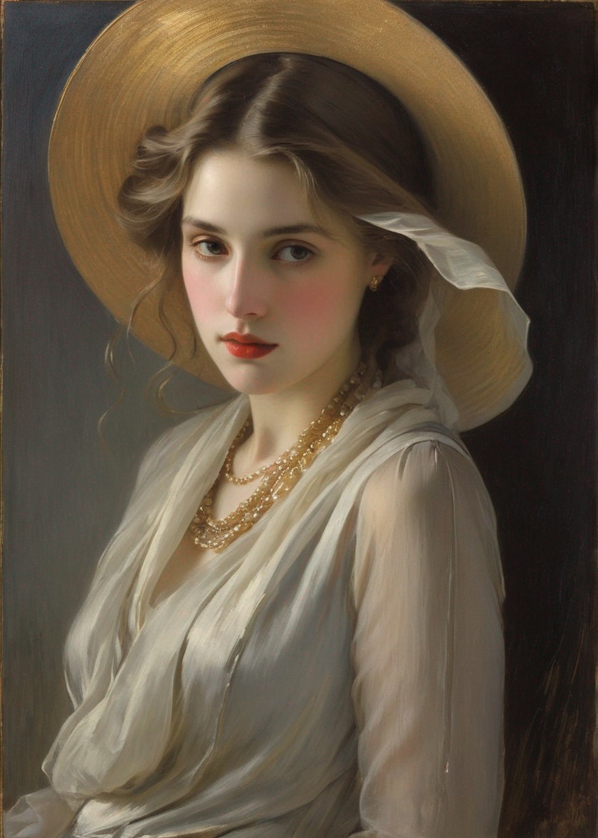 + Prompt:The paintings by Léon Comerre, Slawa Prischedko, John Reinhard Weguelin, and John Lavery depicted her in moody, somber, and desaturated colors, evoking a sense of melancholy and introspection. The soft, delicate lighting reminiscent of the golden hour added a touch of ethereal beauty to her already captivating presence
