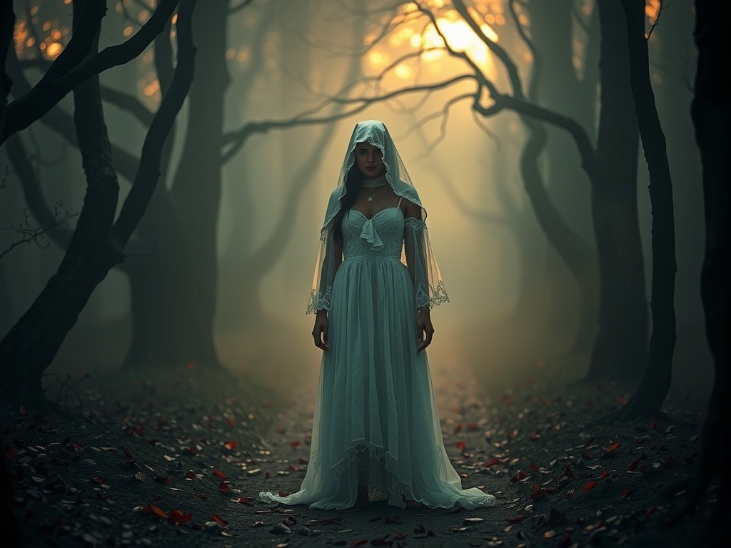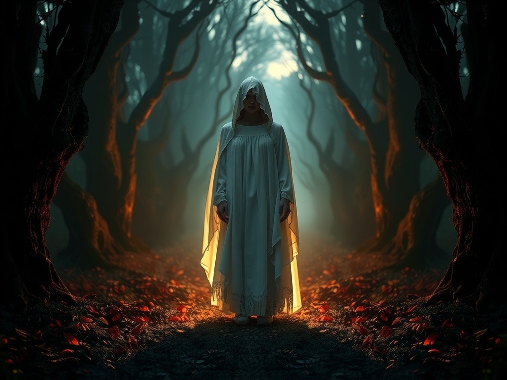 A mysterious figure stands at the center of a haunting forest path, shrouded in an ethereal, flowing white gown that gracefully cascades to the ground. The gown features delicate details and appears slightly tattered at the edges, suggesting a sense of age and mystique. The figure wears a matching hood that conceals their face, further enhancing the enigmatic atmosphere. The scene is illuminated by soft, warm light filtering through the dense trees, casting long shadows and creating a dreamlike quality.