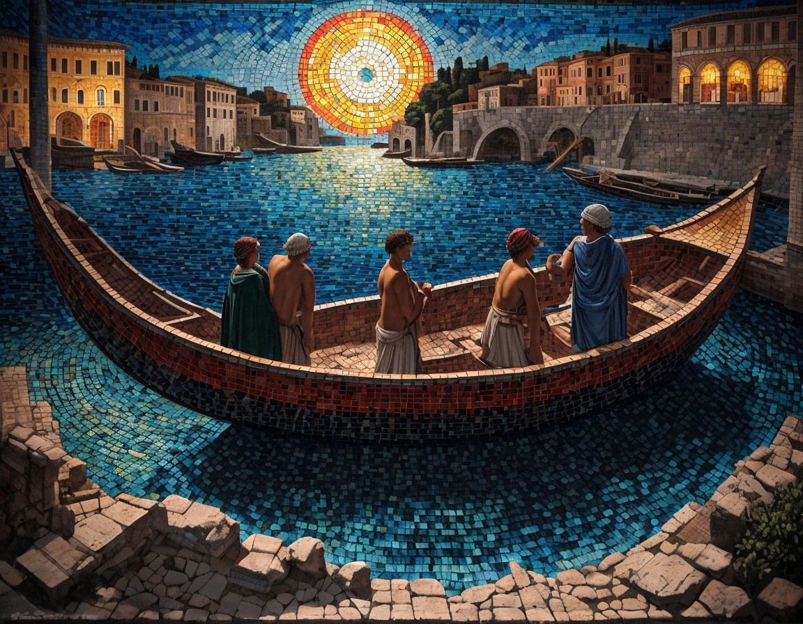 Inspired by Roman frescoes, Renaissance art and Dante's Inferno. A cloaked, shadowy boatman leads a small group of travelers out on a surreal tile landscape.