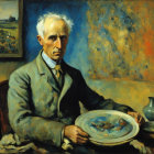 a somber man with white hair holding a palette, dressed in a gray suit. The background features two paintings,