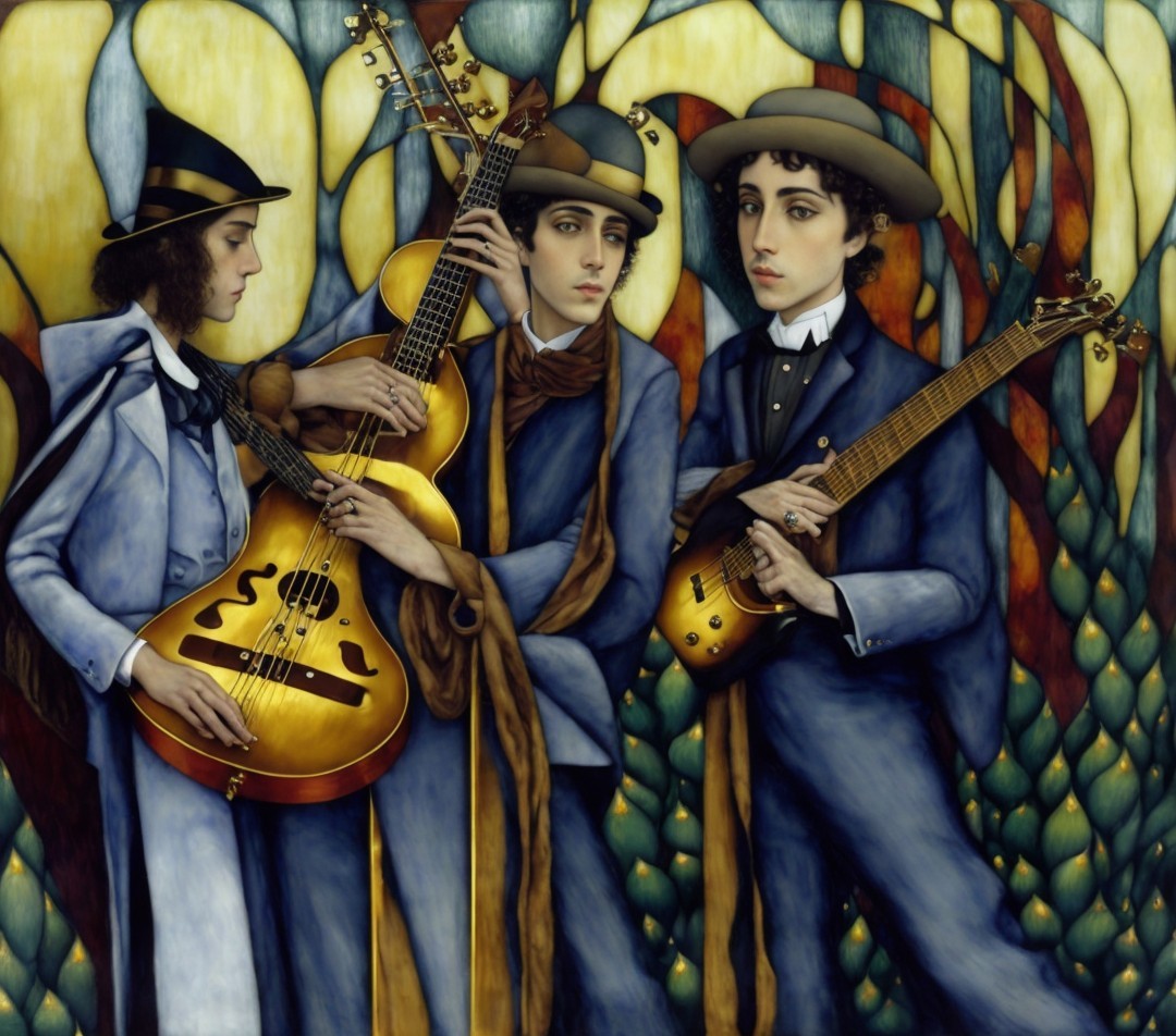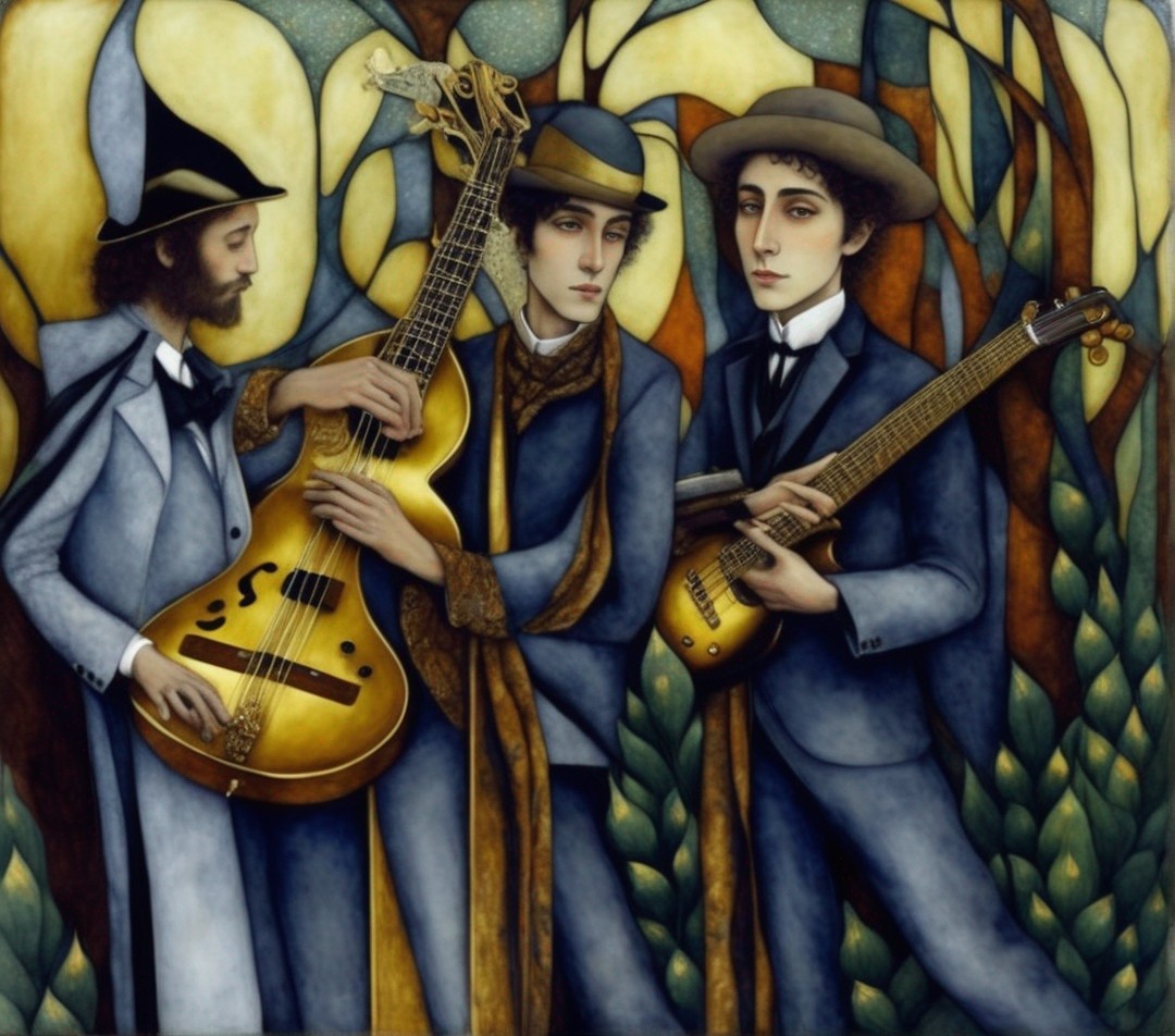 + Prompt:. A male bass player, a poet holding a gilded book, a male guitar player. In the style of Edward Gorey. Exactly like picture drawing by Edward Gorey. Desaturated colors.