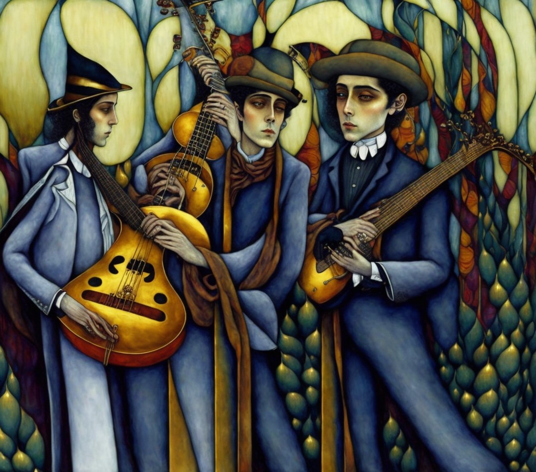 . A male bass player, a poet holding a gilded book, a male guitar player. In the style of Edward Gorey. Exactly like picture drawing by Edward Gorey. Desaturated colors.