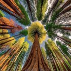 The image captures a stunning view looking up at towering redwood trees, with lush green foliage and a bright blue sky peeking through the branches, creating a serene and majestic natural scene.