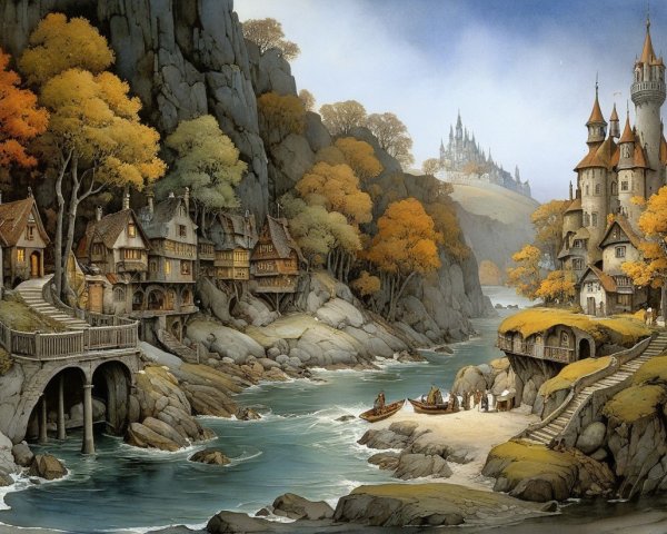 A whimsical, fantastical townscape featuring winding cobblestone paths, ornate buildings, and lanterns. A figure on horseback converses with another near an archway, creating a magical atmosphere.