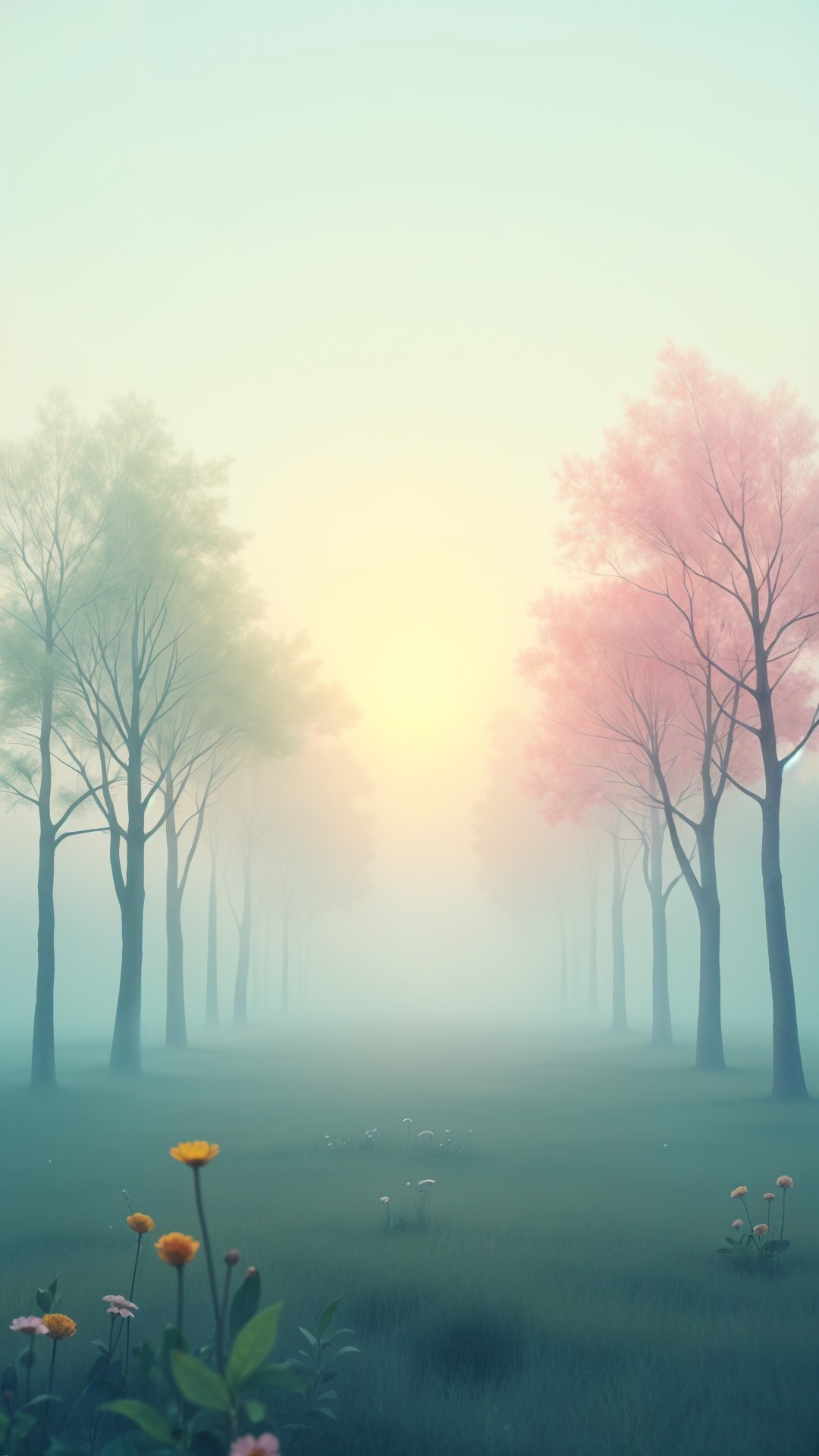 A serene landscape features fog-shrouded trees, with delicate pink blossoms on some branches. The soft pastel colors create a tranquil atmosphere, hinting at dawn's early light.
