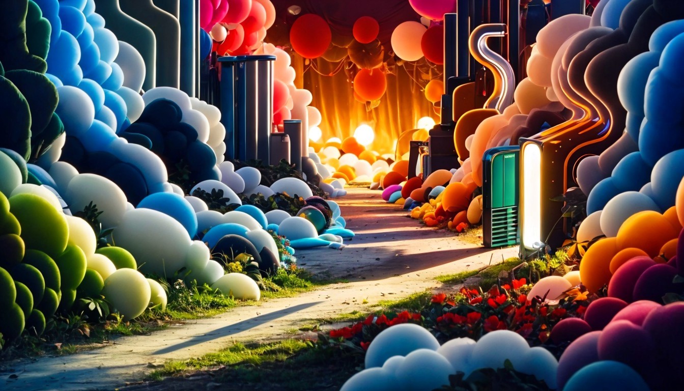 Colorful Balloons and Flowers Light Up Festive Pathway at Dusk
